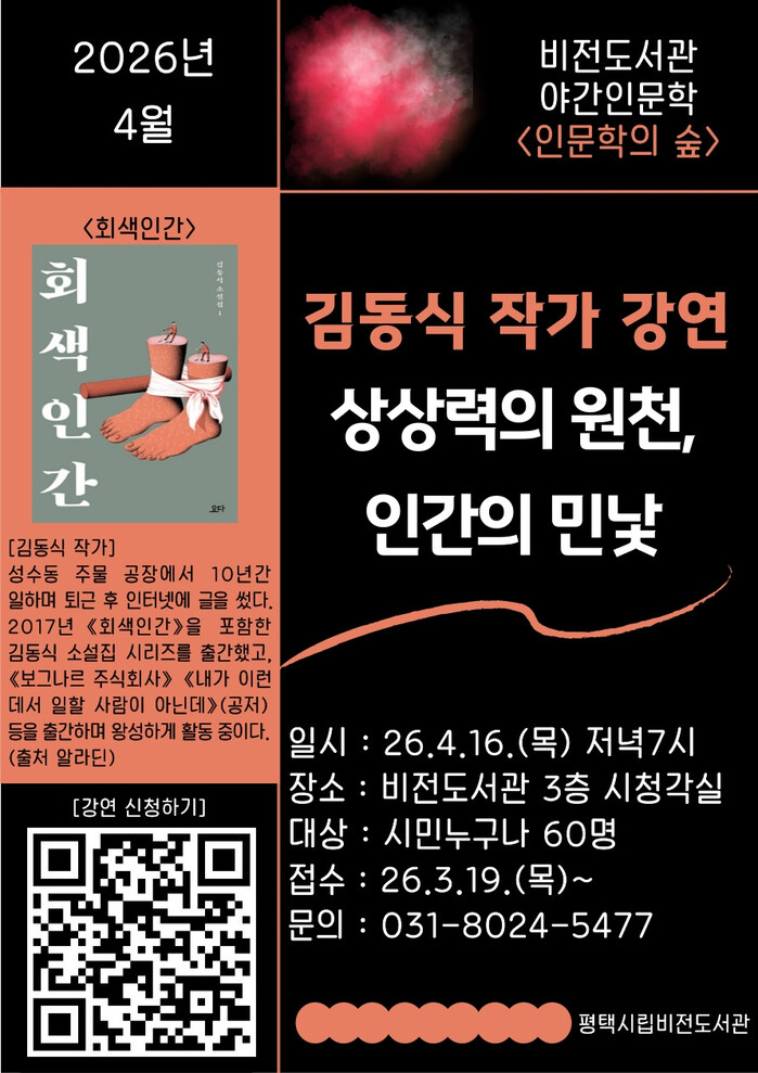 [평택=오왕석 기자] 평택시 비전도서관은 오는 4월 16일(목) 저녁 7시 김동식 작가를 초청하여 ‘상상력의 원천, 인간의 민낯’을 주제로 야간 인문학 강연을 진행한다.