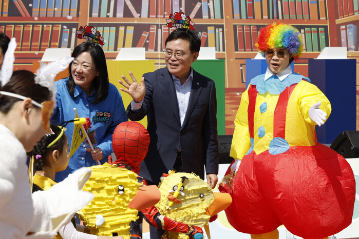 진교훈 서울 강서구청장이 최근 방화근린공원 일대에서 열린 ‘제14회 강서어린이 동화축제’를 찾아 아이들과 시간을 함께했다. 사진은 진 구청장(가운데)이 한정애 국회의원(맨 오른쪽) 등과 행사장으로 들어오는 아이들과 인사하는 모습. (사진=강서구청 제공)