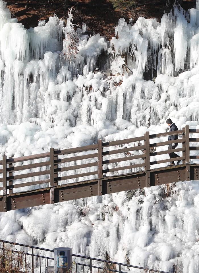 추위가 맹위를 떨치는 절기상 소한(小寒)을 이틀 앞둔 3일 대구 달성군 옥연지 송해공원에 며칠간 강추위가 몰아치며 빚어낸 거대한 빙벽이 장관을 이루고 있다. (사진제공 = 연합뉴스)