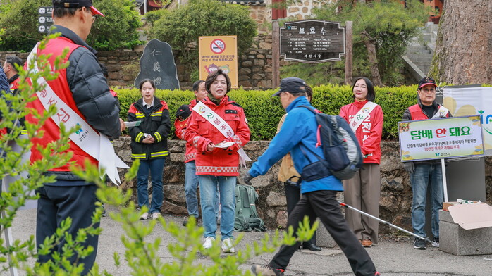경기 과천시가 지난 11일 관악산 주등산로 입구에서 산불 예방 캠페인을 진행했다. 이날 행사에는 신계용 시장을 비롯한 관계 공무원, 산림재난대응단, 산불감시원 등 60여명이 참여해 캠페인을 진행했다. 사진은 신 시장 및 참석자들이 켐페인을 진행 중인 모습. (사진=과천시청 제공)