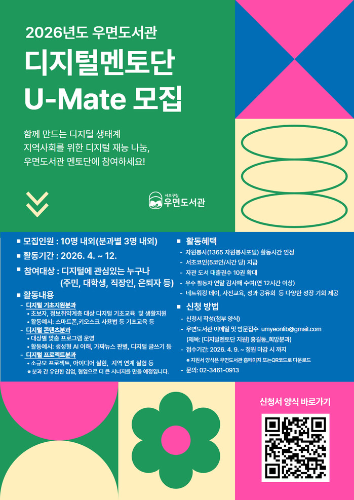 | ▲ 2026년 우면도서관 디지털 멘토단(U-Mate) 모집 포스터. (사진=서초문화재단 제공) |