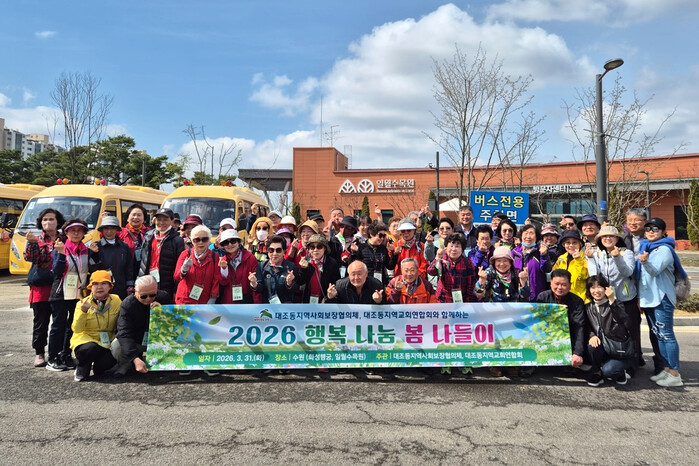 서울 은평구 대조동이 최근 ‘행복 나눔 봄나들이’ 행사를 열고 행사 참여자 40여명과 함깨 수목원과 수원 화성행궁을 방문해 자연과 역사 문화를 체험했다. 사진은 기념촬영 모습. (사진=은평구청 제공)
