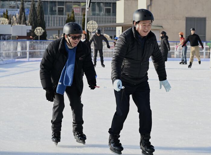 | ▲ 임병택 시흥시장과 시각장애인협회장이 거북섬 스케이트장에서 스케이트를 타고 있다 /사진제공=시흥시 |