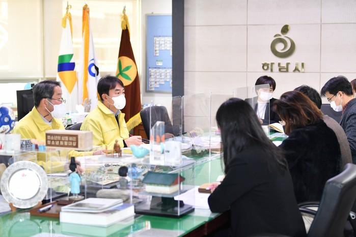 김상호 경기 하남시장은 지난 17일 시정 주요 사업을 점검하고 효율적인 추진을 위해 ‘2022년 주요업무계획 보고회’ 첫날 회의를 주재했다. 보고회 첫날은 정책기획관, 청렴감사관, 도시브랜드담당관, 정보통신담당관, 일자리경제과 순으로 진행했다. 사진은 김 시장(왼쪽 두 번째)이 보고회를 주재하고 있는 모습. (사진제공=하남시청)