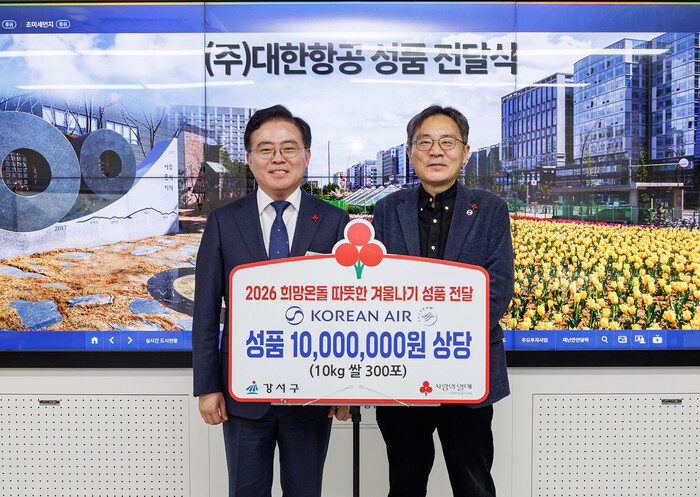 서울 강서구가 지난 8일 ‘이웃돕기 성품 전달식’을 개최하고 대한항공으로부터 이웃돕기 성품을 전달받았다. 사진은 전달식에서 진교훈 구청장(왼쪽)이 지상휘 대한항공 사회봉사단 운영위원장과 기념 촬영을 하는 모습. (사진=강서구청 제공)