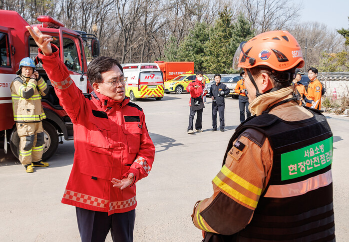 건조한 날씨와 강풍으로 산불 우려가 커지는 가운데 서울 강서구가 최근 ‘유관기관 합동 산불진압훈련’을 열고 기관별 협조체계를 점검했다. 사진은 진교훈 구청장(왼쪽)이 훈련에서 소방대원과 함께 훈련 진행 상황을 점검하는 모습. (사진=강서구청 제공)