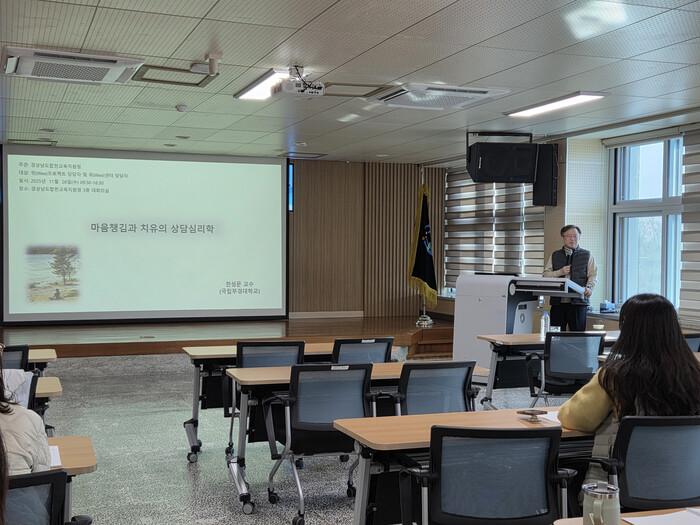 연수 강사로는 부경대학교 평생교육상담학전공 천성문 교수가 진행하였다. 마음챙김의 이론적 이해, 학생 상담 과정에서의 치유적 개입 전략, 상담자 소진 예방을 위한 셀프 케어 기법 등 실질적인 내용에 대해 강의하여 참여자들의 이해를 도왔다.