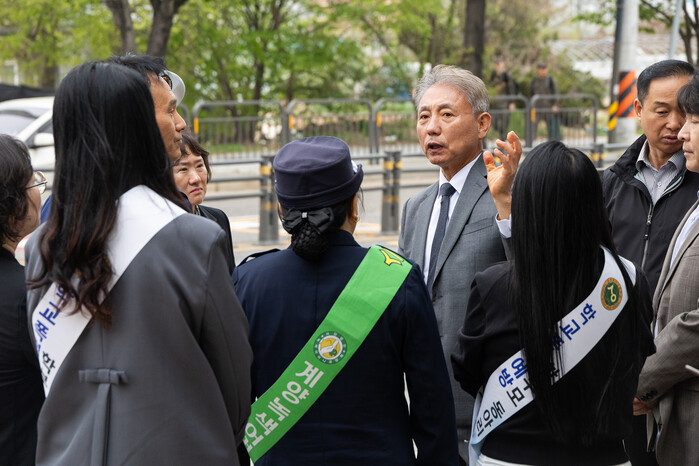 | ▲ 상반기 교통안전 캠페인에 참여한 윤환 구청장이 참여자들과 의견을 나누고 있다. (사진=인천 계양구청 제공) |
