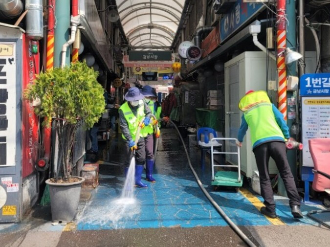 서울 성동구가 봄철을 맞이해 겨우내 쌓인 도로변 먼지와 미세먼지를 제거하고 쾌적한 도시환경을 조성하기 위해 이달부터 4월 말까지 대로변 보도 및 보도상 시설물을 대상으로 물청소를 실시한다. 사진은 금남시장 봄맞이 물청소하는 모습. (사진=성동구청 제공)