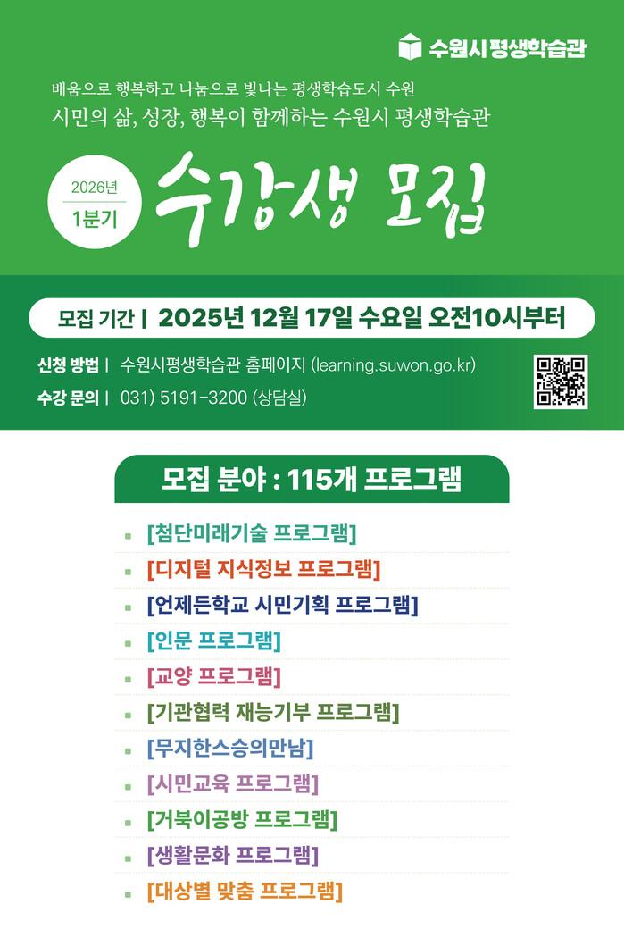 [수원=임종인 기자] 경기 수원시평생학습관이 17일 오전 10시부터 2026년 1분기 수강생을 모집한다.