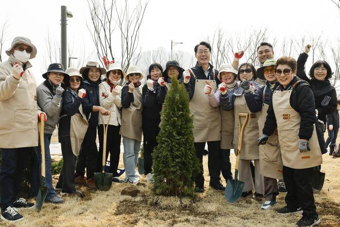 | ▲ 정명근 화성특례시장이 시민들과 함께 기념 식수 후 기념촬영을 하고 있다 /사진제공=화성특례시 |