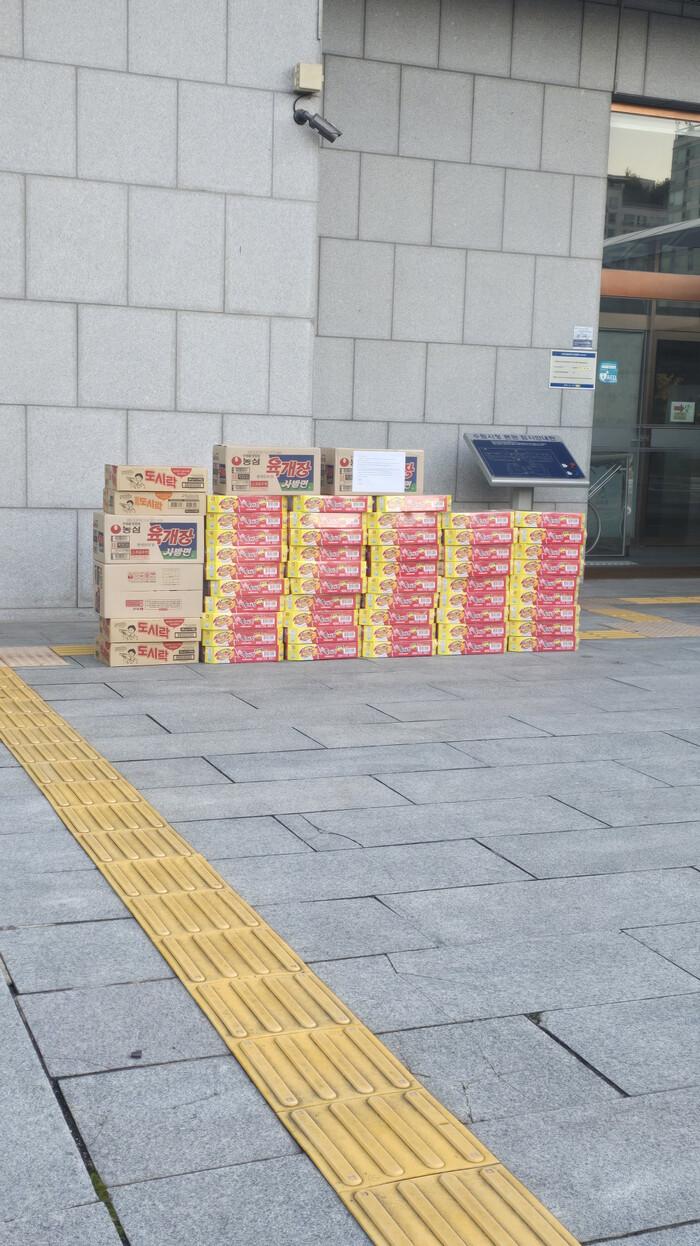 [수원=임종인 기자] 익명의 기부자가 컵라면 56상자와 ‘산불 예방을 위해 고생하는 공직자들에게 전달해 달라’는 내용의 편지를 27일 새벽 경기 수원시청 본관 정문 앞에 두고 갔다.