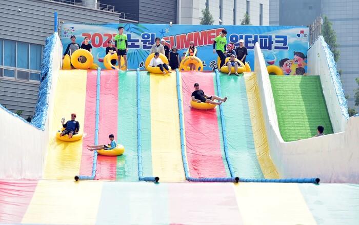 | ▲ 노원 워터파크 80m 워터슬라이드를 즐기고 있는 물놀이객들의 모습. (사진=노원구청 제공) |