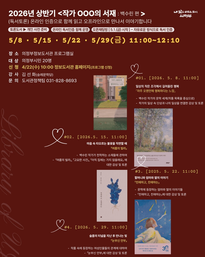 [시민일보 = 민장홍 기자] 경기 의정부시는 올해 상반기 ‘작가 OOO의 서재: 백수린 편’을 5월 매주 금요일(8ㆍ15ㆍ22ㆍ29일) 총 4회에 걸쳐 의정부정보도서관에서 운영한다.