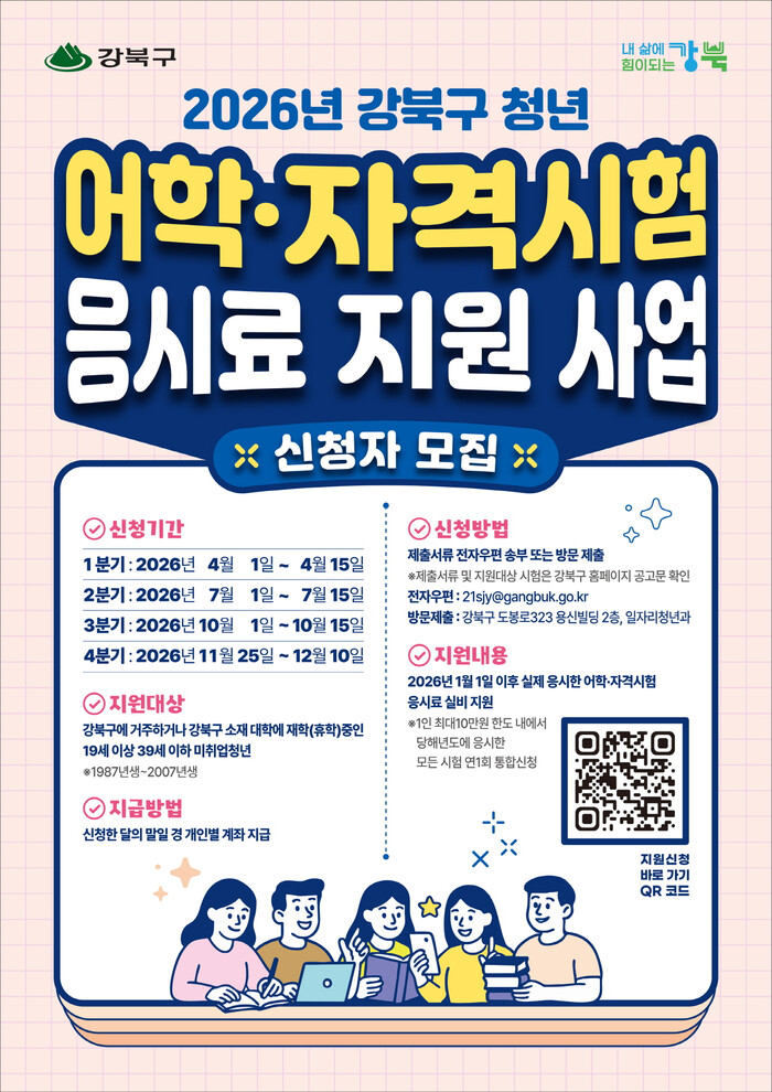 [시민일보 = 문민호 기자] 서울 강북구(구청장 이순희)는 미취업 청년의 취업 준비 비용 부담을 덜기 위해 ‘청년 어학·자격시험 응시료 지원 사업’을 전년보다 확대 시행하고, 총 900명을 모집한다. 이는 지난해보다 200명 늘어난 규모다.