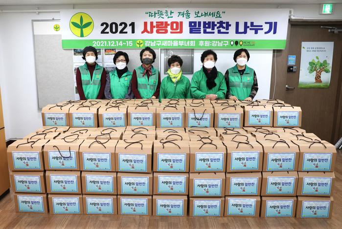 서울 강남구가 지난 15일 ‘사랑의 밑반찬 나누기’ 행사를 진행했다. 이날 참여자들은 밑반찬 8종(떡국떡·청국장 등)을 직접 포장해 지역내 홀몸노인, 소년·소녀 가장 등 취약계층 200가구에 전달했다. 사진은 전달식에서 관계자들이 기념촬영을 하는 모습. (사진제공=강남구청)