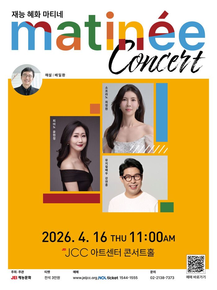 재능문화 관계자는 “목소리는 인간이 지닌 가장 섬세한 악기이며, 피아노와 어우러질 때 그 울림은 더욱 깊어져 마음을 조용히 두드린다”며, “이번 마티네 공연을 관람하시는 분들은 ‘도심 속 따뜻한 울림과 편안한 쉼’을 느낄 수 있을 것”이라고 밝혔다.