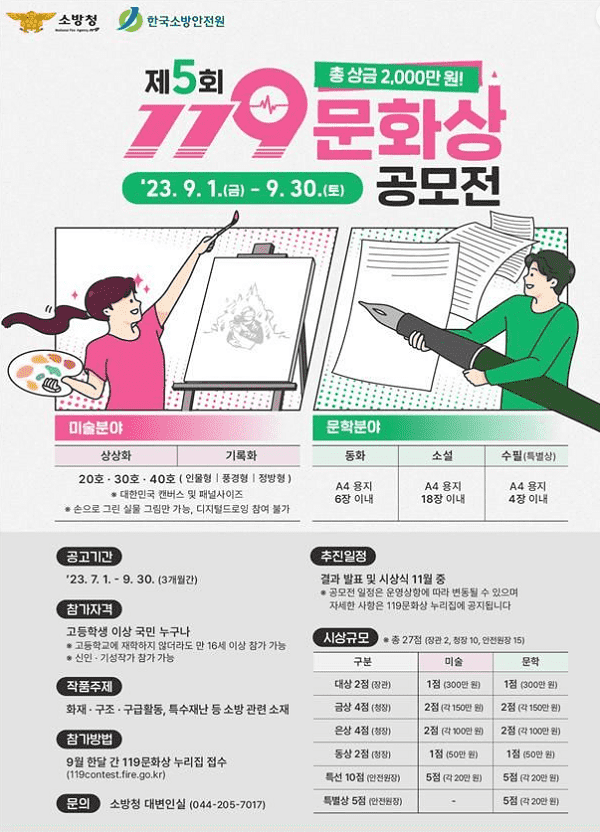 119문화상은 만 16세이상 국민이라면 누구나 참여할 수 있다. 이번 119 문화상의 공모 주제는 ▲화재 구조 구급 등 재난 현장 소방 활동 ▲미래 소방관 ▲과거 대형 재난 등 소방 안전과 관련된 소재로 한 작품이다.