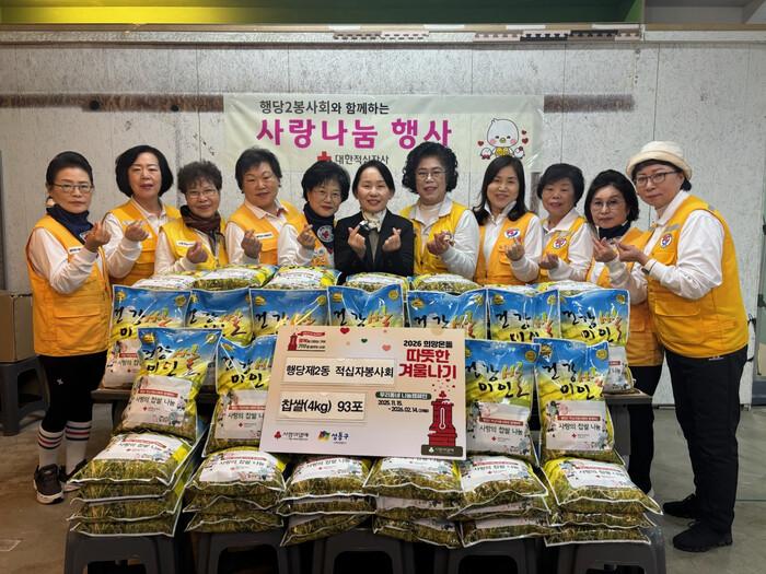 서울 성동구 행당제2동 적십자봉사회가 최근 '사랑의 쌀' 전달식을 진행했다. 이번 전달식에서는 복지사각지대에 놓인 홀몸노인 등에게 따뜻한 겨울을 보낼 수 있도록 찹쌀(4kg) 93포를 기탁했다. 사진은 전달식에서 관계자들이 기념 촬영을 하는 모습. (사진=성동구청 제공)