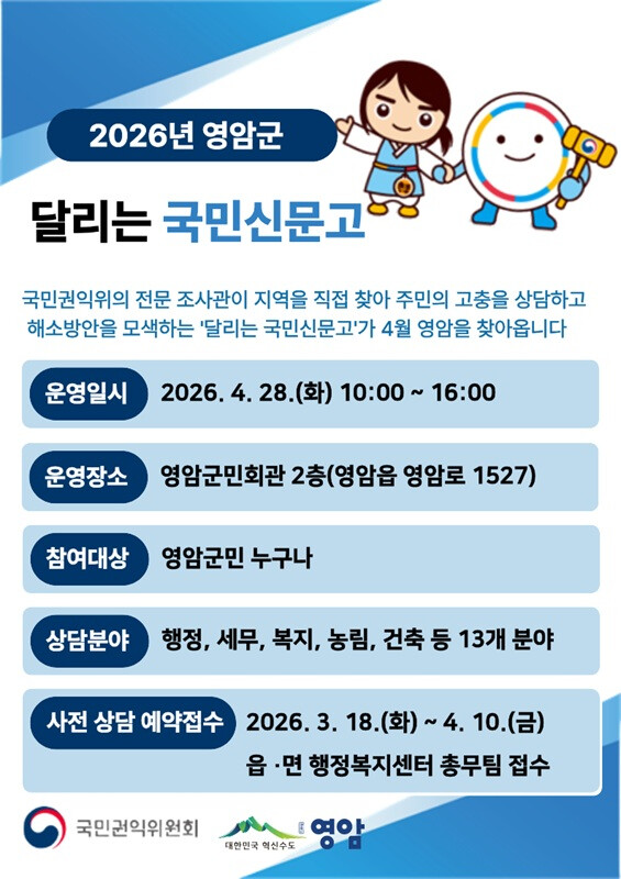신환종 영암군 기획예산실장은 “군민의 고충은 현장에서 해결해야 한다”며 “이번 국민신문고가 실질적인 문제 해결로 이어지도록 적극 지원하겠다”고 말했다.