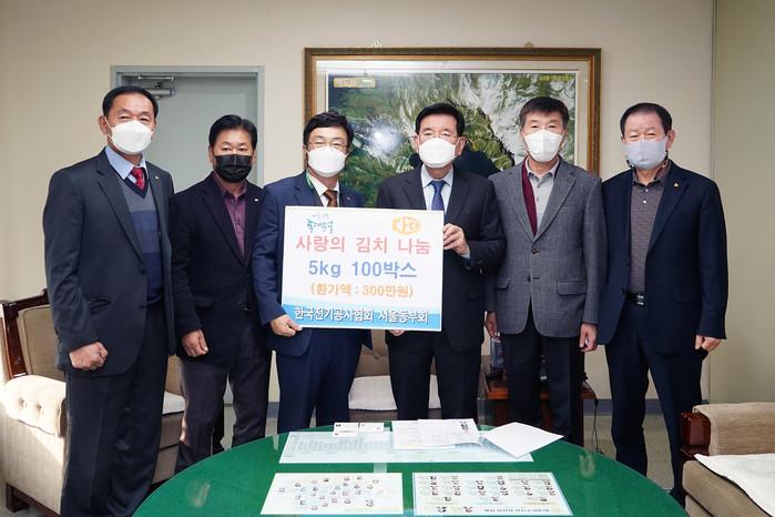 서울 동대문구는 16일 한국전기공사협회 서울시동부회로부터 김치 5kg 100상자(환가액 300만원 상당)를 전달받았다. 사진은 전달식에서 유덕열 구청장(오른쪽 세 번째)과 관계자들이 기념촬영을 하는 모습. (사진제공=동대문구청)