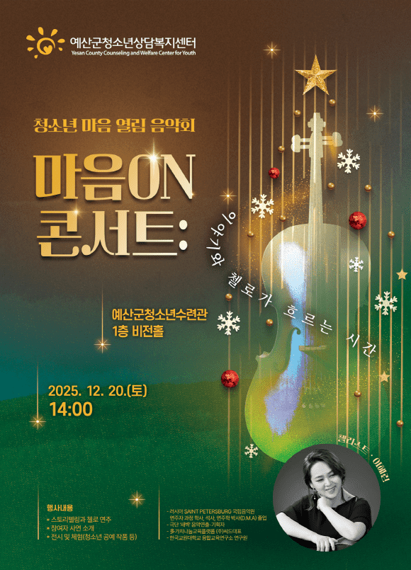 이번 음악회는 첼로 연주와 이야기 나눔을 결합한 치유형 공연으로 이혜린 첼리스트의 스토리텔링 연주를 통해 심리적 긴장을 완화하고 연주자와 참여자 간 진솔한 소통을 통해 정서적 안정과 마음 회복의 시간을 제공하고자 마련됐다.