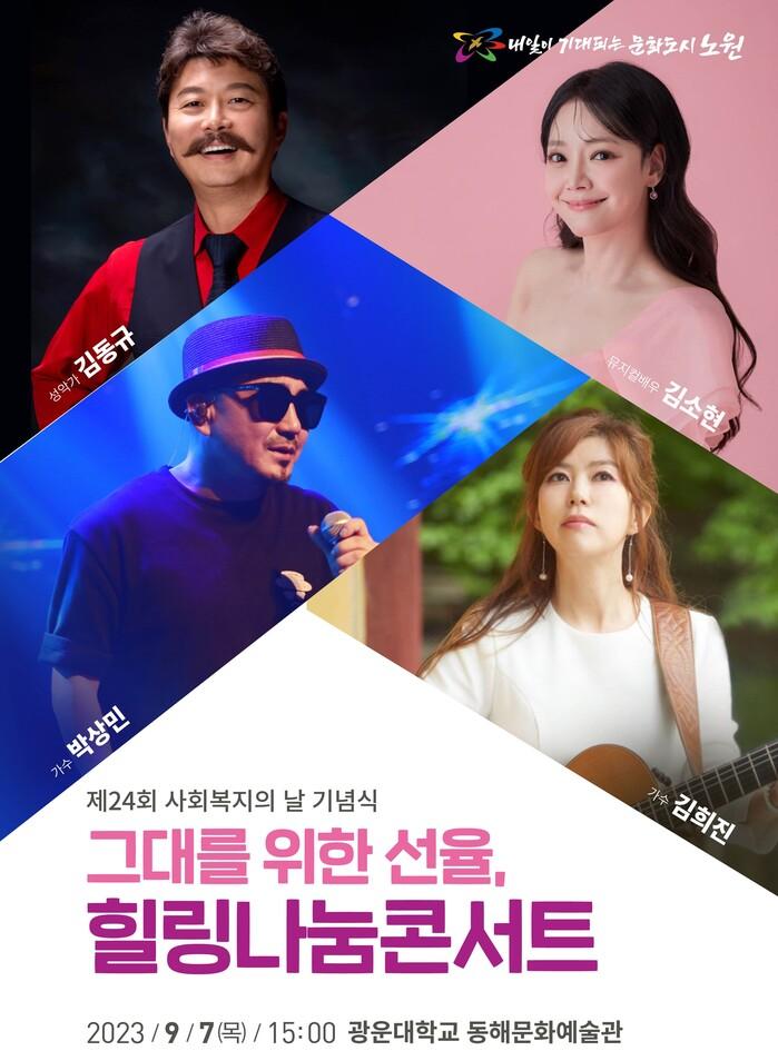 구와 지역사회보장협의체가 주최하고, 노원문화재단이 주관하는 제24회 사회복지의 날 기념식 '그대를 위한 선율, 힐링나눔콘서트'는 이날 오후 3시 광운대학교 동해문화예술관 대극장에서 열린다.