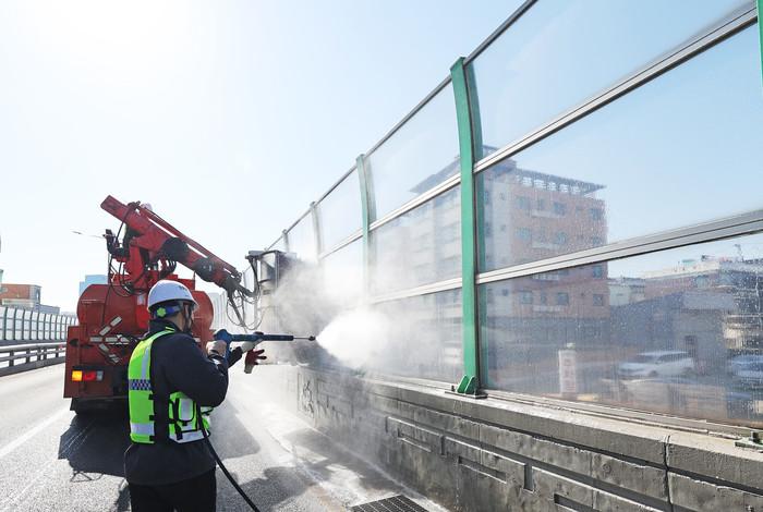 2일 경기 수원시 동수원고가차도에서 팔달구청 관계자들이 봄을 맞아 청소 차량 등을 이용해 방음벽 등 도로 시설물 청소를 하고 있다.