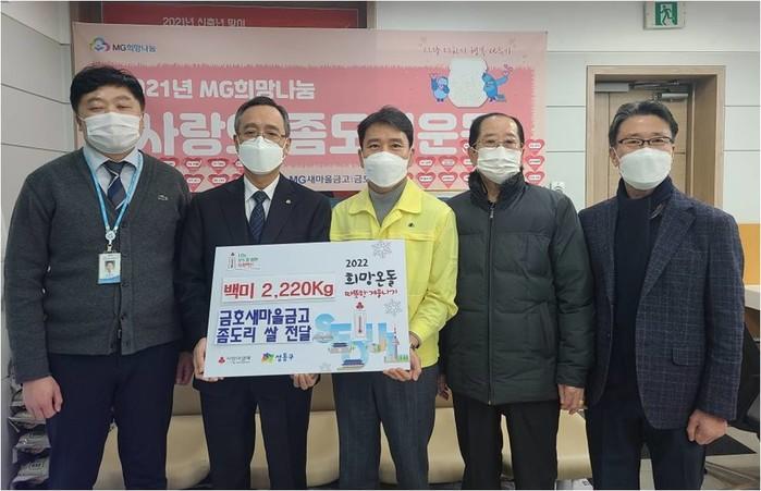 금호새마을금고는 최근 '사랑의 좀도리 운동'을 통해 마련한 백미 20kg 111포(2220kg)를 서울 성동구 금호2,3가동 주민센터에 후원했다. 쌀은 홀몸노인과 중장년 1인 가구, 한부모가구 등에 전달된다. 사진은 전달식에서 관계자들이 기념촬영을 하는 모습. (사진제공=성동구청)