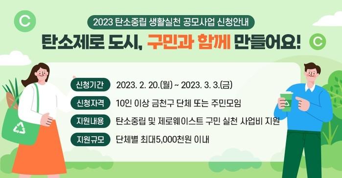 [시민일보 = 여영준 기자] 서울 금천구(구청장 유성훈)는 오는 3월3일까지 ‘2023 탄소중립 생활실천 공모사업’ 참여단체를 모집한다고 22일 밝혔다.