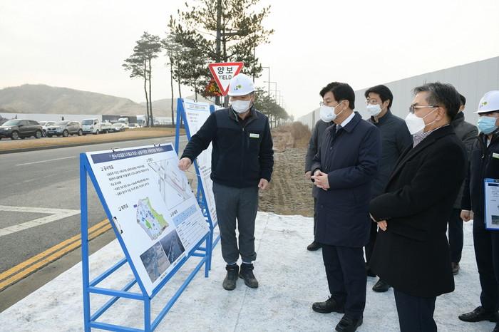 이춘희 세종시장이 최근 출근시간대에 5생활권 너래교차로를 찾아 교통상황을 면밀히 살펴보고 시민 불편 해소를 위한 도로 교통 추진상황도 함께 점검했다. 이 시장은 오는 9일에도 출근시간대 상습정체를 겪고 있는 1생활권 은하수 교차로에 현장점검을 나설 계획이다. 사진은 이 시장(가운데)이 관계자에게 설명을 듣고 있는 모습. (사진제공=세종시청)