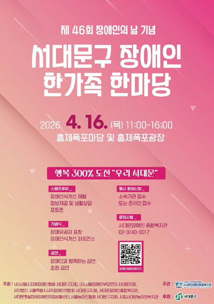 [시민일보 = 이대우 기자] 서울 서대문구(구청장 이성헌) 홍제폭포광장 및 홍제폭포마당 일대에서 16일 오전 11시~오후 4시 ‘서대문구 장애인 한가족 한마당’이 개최된다.