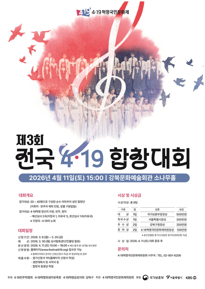 [시민일보 = 문민호 기자] 서울 강북구(구청장 이순희)가 오는 4월11일 오후 3시 강북문화예술회관 소나무홀에서 '제3회 전국 4.19 합창대회'를 개최한다.