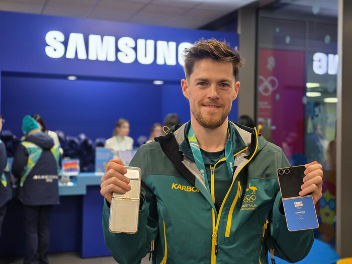 | ▲ 브렌던 코리 (Brendan Corey / 호주, 스피드 스케이팅) 선수가 밀라노 올림픽 선수촌 내 삼성 체험관에 방문해 갤럭시 Z 플립7 올림픽 에디션과 지난 베이징 동계올림픽 갤럭시 Z 플립3 올림픽 에디션을 함께 보여주고 있다.(사진=삼성전자 제공) |