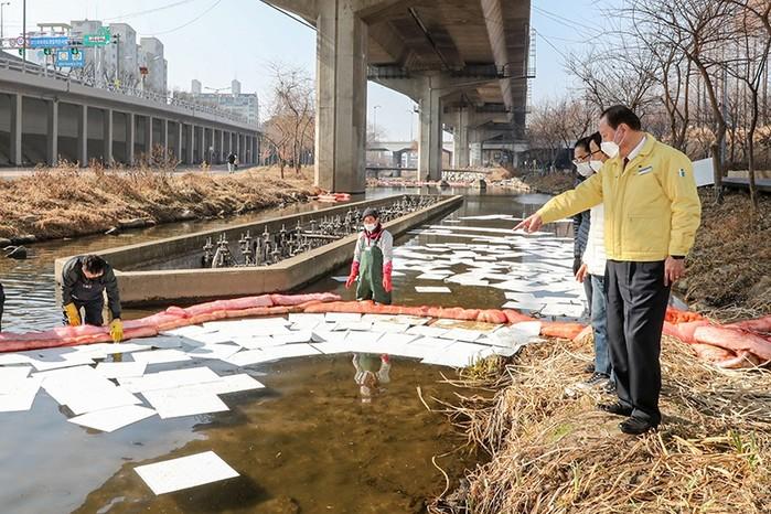 유동균 서울 마포구청장은 최근 서대문구 연가교 인근 우수관로에서 하천에 유입된 기름 관련 홍제천내 기름때 제거 작업에 힘쓰는 관계자들을 격려했다. 한강으로의 유입을 막기 위한 흡착붐 6개를 설치하고 하천수 오염을 방지하기 위해 흡착포 2000여장을 투입했다. 사진은 이날 유 구청장(오른쪽)이 관계자들과 대화를 나누고 있는 모습. (사진제공=마포구청)