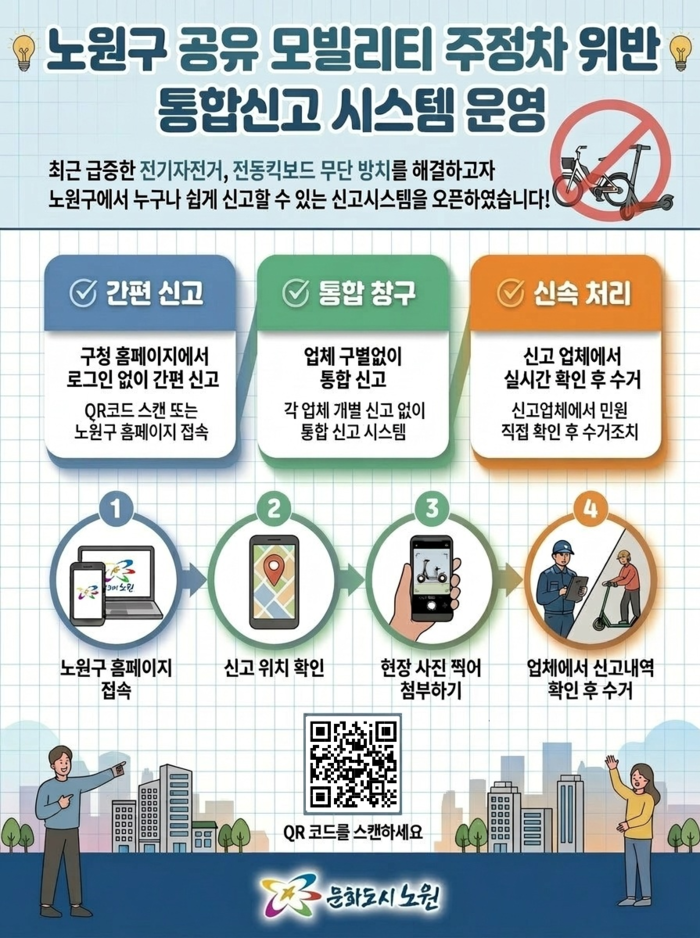 [시민일보 = 박소진 기자] 서울 노원구(구청장 오승록)가 ‘공유 모빌리티 통합 신고시스템’을 구축하고, 지난 20일부터 운영을 시작했다고 밝혔다.