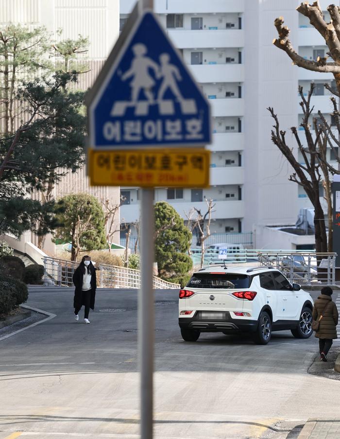 11일 서울 성북구의 한 아파트 단지 내 통행로에서 주민이 어린이보호구역 표지판이 세워진 차량 통행로를 건너고 있다. 경찰청은 이날 도로교통법 개정안이 공포돼 6개월 후인 7월12일부터 시행된다고 밝혔다. 아파트 단지 내에선 보행자를 의무적으로 보호해야 한다.