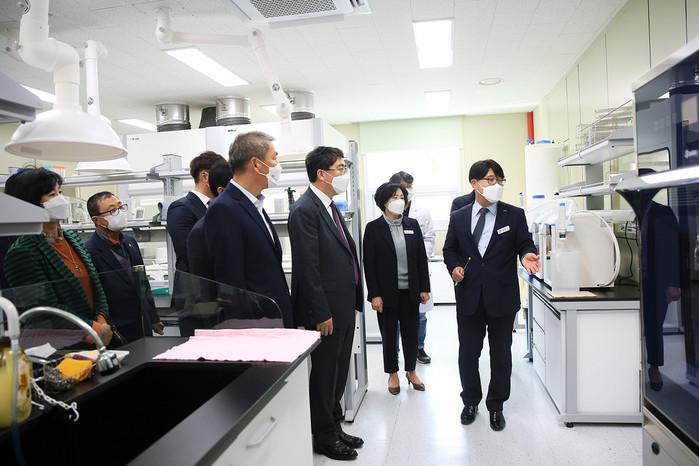 충남 서산시가 11일 농업환경을 분석해 수치화된 정보를 바탕으로 지속가능한 농업 유지를 도울 '서산시 농업환경분석센터' 조성을 완료하고 준공식을 개최했다. 센터는 연면적 551.34㎡, 지상 2층 규모로 조성됐으며, 농산물 잔류농약 320성분 전처리 및 정밀분석장비 42종 64대를 갖췄다. 사진은 이날 행사에 참석한 맹정호 시장이 관계자들과 센터 내부를 둘러보는 모습. (사진제공=서산시청)