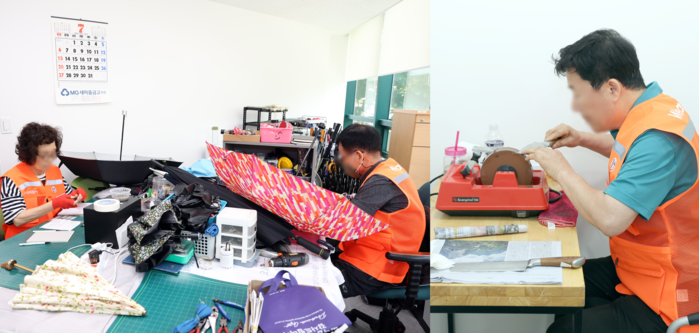 | ▲ ‘동작 맥가이버센터’ 근무자들이 우산 수리와 칼갈이를 하고 있는 모습. (사진=동작구청 제공) |
