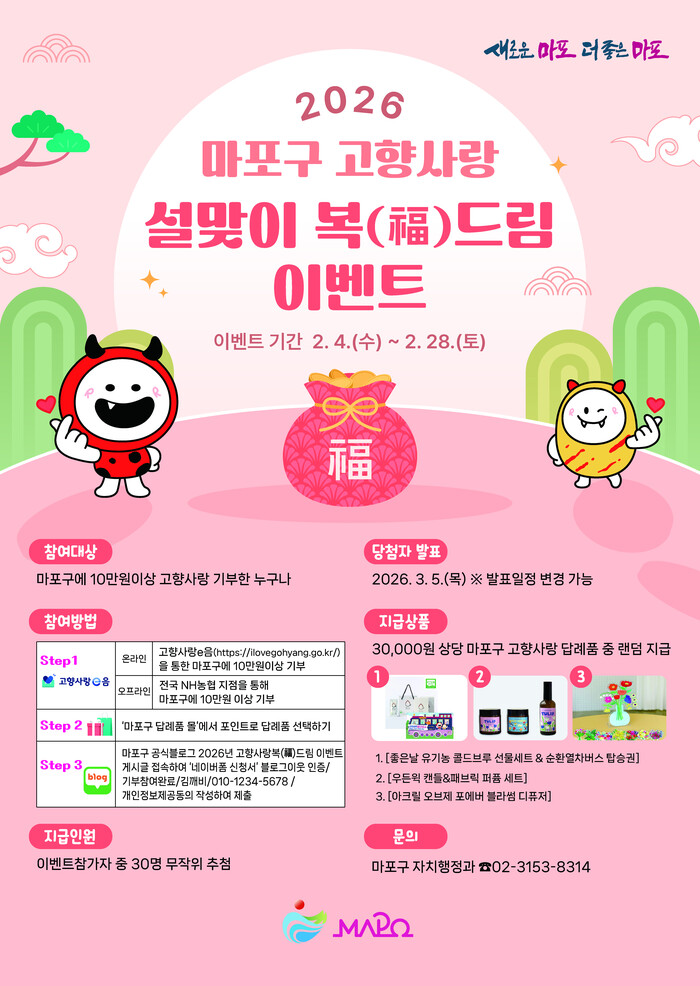 [시민일보 = 문민호 기자] 서울 마포구(구청장 박강수)는 고향사랑기부제 참여를 확대하고 기부 문화를 확산하기 위해 ‘2026년 설맞이 고향사랑 복(福)드림 이벤트’를 운영하고 있다고 11일 밝혔다.