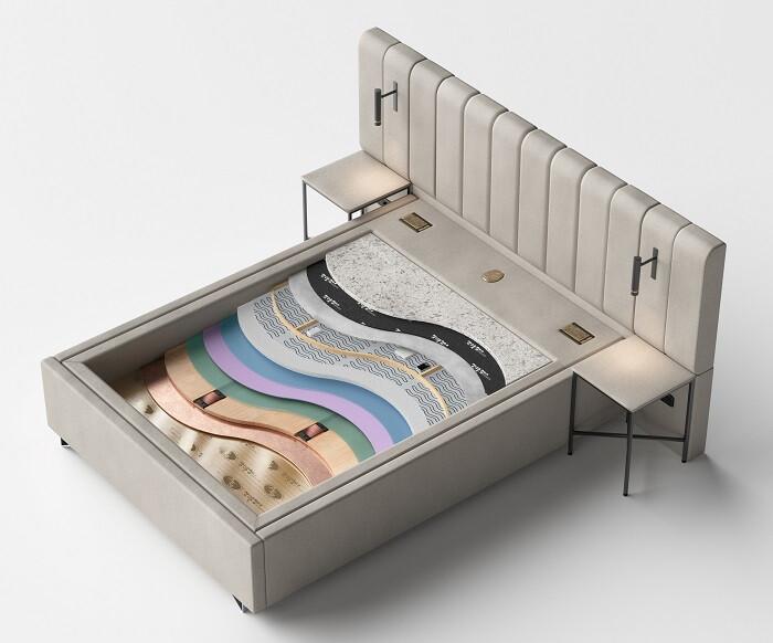 기존 전도열 방식의 경우 열선이 지나가는 자리가 상대적으로 더 뜨거워 열 분포가 고르지 못한 한계가 있었으나, 복사열 방식을 사용하는 히팅플로어는 침대 전면의 온도가 빈틈없이 균일하게 유지되는 것이 특징이다. 이를 통해 사용자는 배김 없는 편안함과 더불어, 몸 속 깊이 은은하게 스며드는 최적의 수면 온도를 경험할 수 있다.