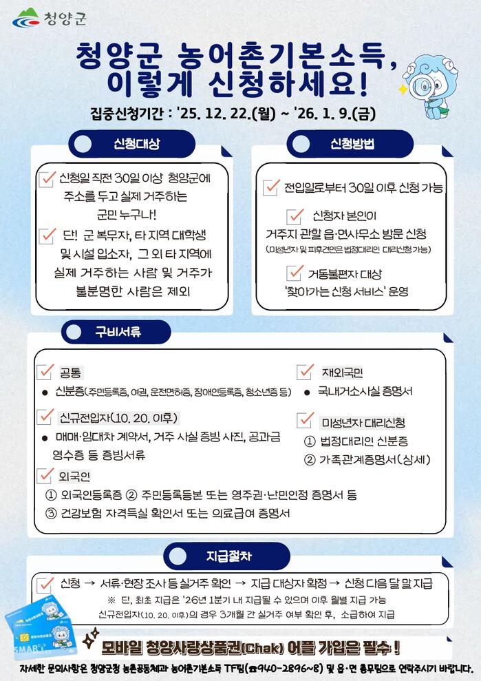 아울러 군은 마을별 집중 신청 기간을 운영하고, 이장회의, 마을방송, 문자발송 등 다양한 방법을 통해 신청 기간과 세부 일정 등을 안내할 계획이다.