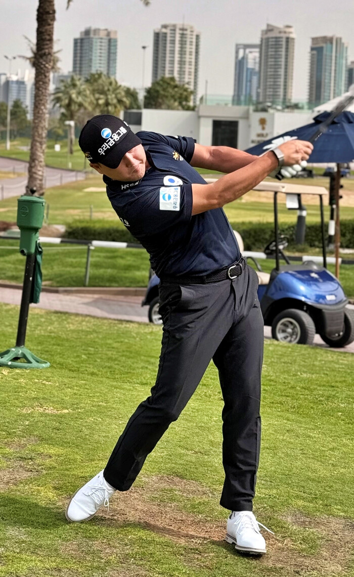 | ▲ 우리금융그룹 후원 선수 이태훈이 LIV GOLF 출전을 앞두고 연습라운드에서 힘찬 샷을 선보이고 있다. (사진=우리금융그룹 제공) |