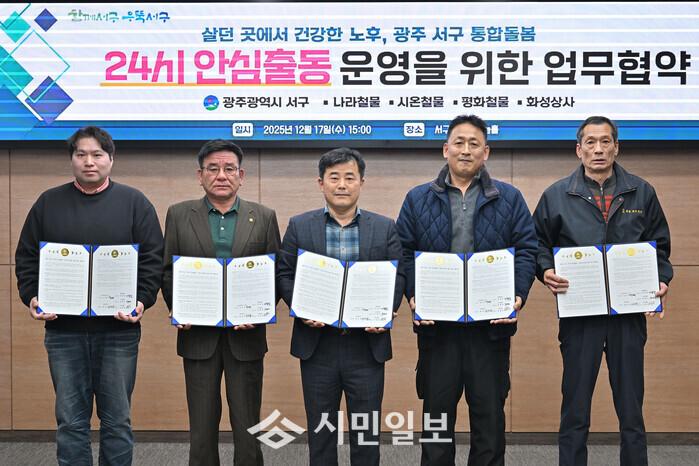 서구는 17일 서구청 나눔홀에서 관내 착한가게 4곳과 함께 ‘24시 안심출동’ 사업의 안정적 운영을 위한 업무협약을 맺고 빈틈없는 돌봄 서비스 제공에 협력하기로 했다.