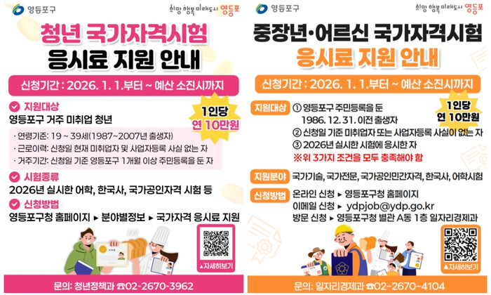 [시민일보 = 여영준 기자] 영등포구(구청장 최호권)는 구민의 취‧창업 역량 강화를 위해 청년부터 중장년‧어르신까지 전 연령 구직자를 아우르는 ‘국가자격시험 응시료 지원 사업’을 추진한다고 19일 밝혔다.