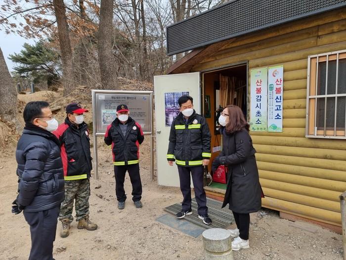 경기 수원시가 17일 권선구 칠보산 일원에서 건조한 날씨에 발생하기 쉬운 산불을 예방하기 위해 산불 방지 시설 점검을 진행했다. 오기영 시 공원녹지사업소장을 비롯한 시·구청 담당 공직자들은 칠보산 일원(여가녹지공원~제1전망대~제2전망대~용화사)을 돌며 산불소화시설, 산불감시초소·감시탑 등 시설을 점검했다. 사진은 시 관계자들이 산불 방지 시설을 점검하고 있는 모습. (사진제공=수원시청)