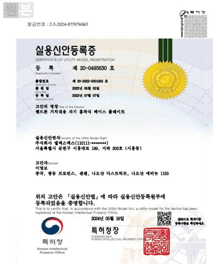 해당 특허는 사용자의 편의성을 증대시키는 ‘자기 흡착식 베이스 플레이트’를 포함하고 있으며, 최신 기술인 핸드폰 뒷면 마그네틱 맥세이프 기능이 활용됐다.