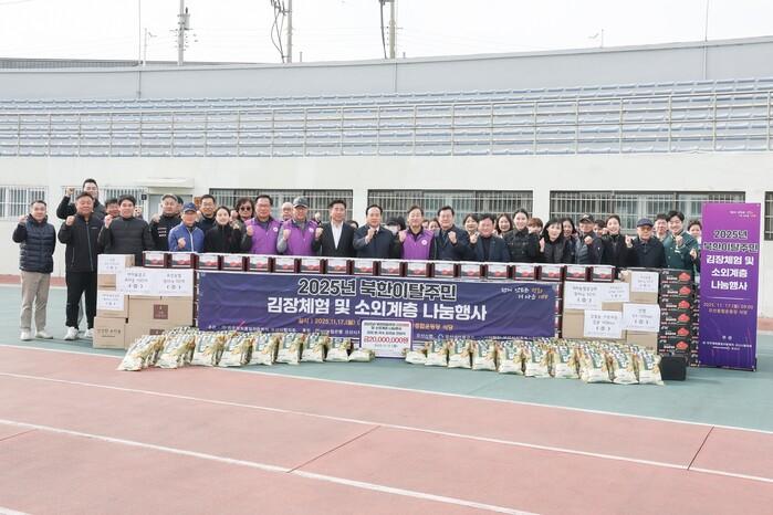 민주평화통일자문회의 오산시협의회가 최근 경기 오산종합운동장에서 북한이탈주민 김장체험 및 소외계층 지원을 위한 나눔 행사를 개최했다. 사진은 이권재 시장이 행사에 참여해 기념 촬영을 하는 모습. (사진=오산시청 제공)