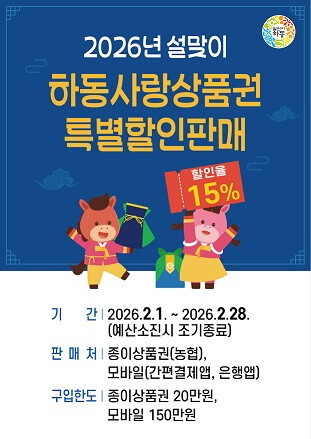 군 관계자는 “설 명절을 앞두고 군민들의 가계 부담을 덜고, 지역 소상공인과 전통시장에 실질적인 도움이 되기를 기대한다”며 “하동사랑상품권과 함께 지역의 온기가 오가는 따뜻한 설 명절을 보내시길 바란다”라고 전했다.