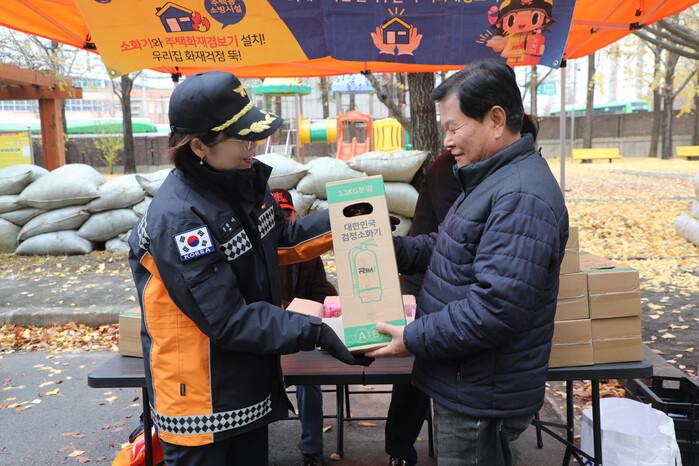 노원소방서는 초기 대응에 필수적인 소화기를 직접 배부해 사용법을 안내했으며, 최근 급증하고 있는 폐배터리 관련 화재 예방을 위한 분리배출 안내문도 함께 전달해 주민들의 관심을 모았다.